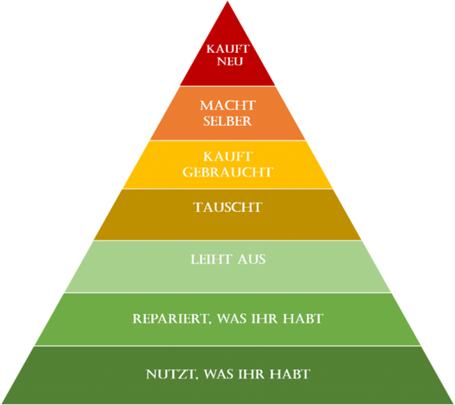 Die Pyramide des nachhaltigen Konsums hilft dir, bewusste Entscheidungen zu treffen, indem sie dir zeigt, welche Optionen das Klima am wenigsten belasten. Von unten nach oben steigt der Ressourcenverbrauch. Deshalb lohnt es sich, immer zuerst die unteren Stufen zu prüfen: