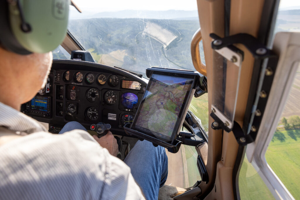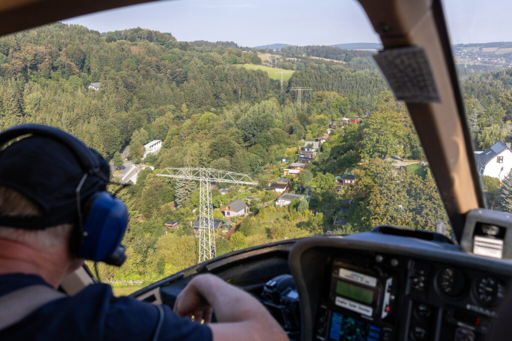 Aus einem Hubschrauber lassen sich Schäden, Veränderungen oder Gefahrenstellen oft viel schneller erkennen als vom Boden aus. Deshalb fliegt das Team die Leitungen mit etwa 15 bis 30 km/h ab – rund 20 Meter über dem Boden und etwa 15 Meter neben der Leitung.